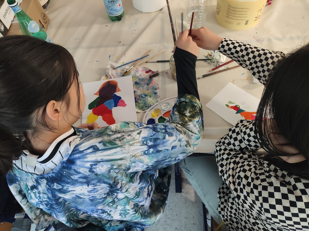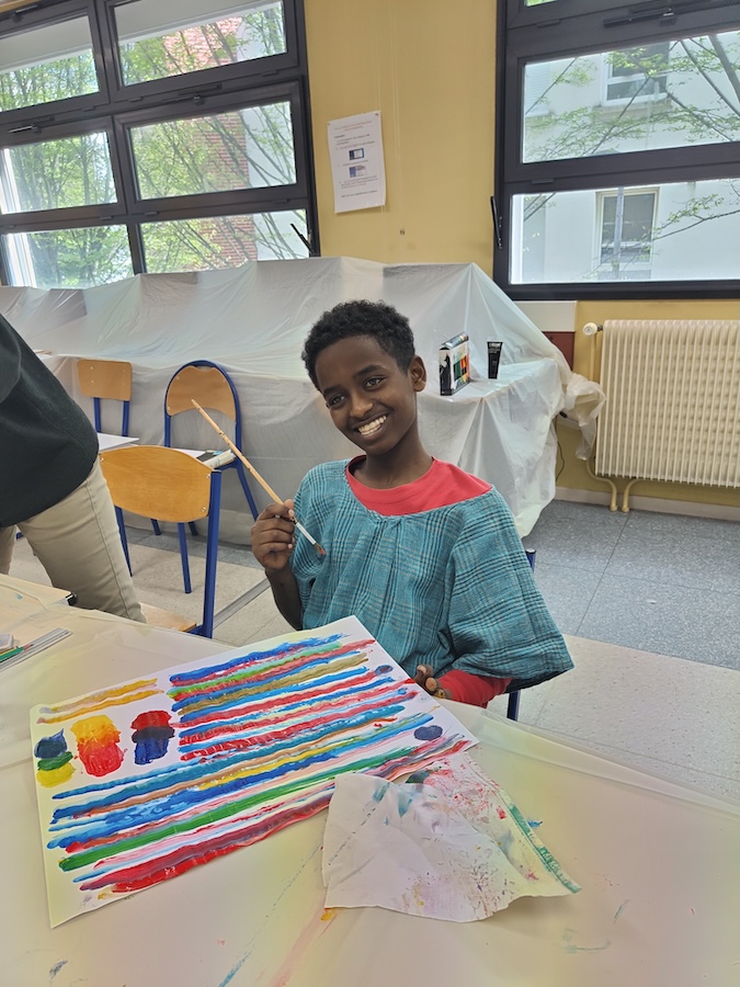 Le deuxième groupe après, avoir revu les bases de la peinture la veille comme les autres jeunes, réalise des peintures inspirées de l’artiste autodidacte Gaston Chaissac qui faisait de l’art brut. Là encore, c’est un festival de couleurs et de formes. L’enseignante remarque qu’il règne dans la classe un calme inhabituel! Avec la peinture et grâce aux supports vidéo projetés par Marie, la barrière de la langue ne semble pas être un problème.