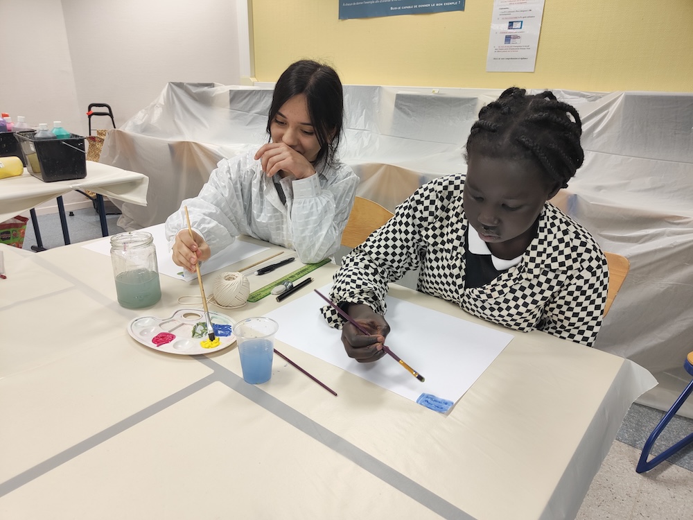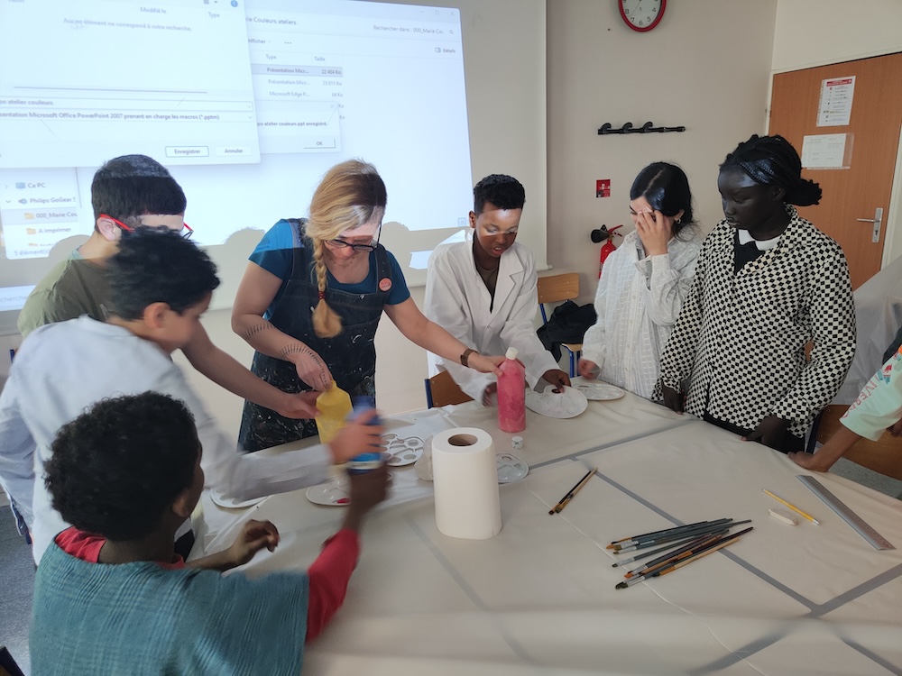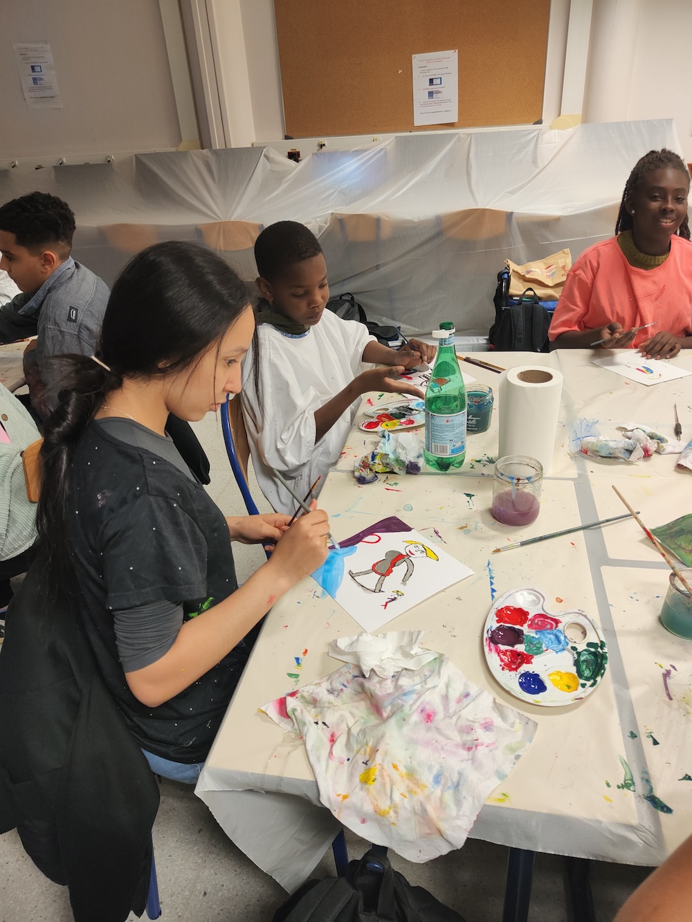 Marie a apporté des blouses de récupération pour ne pas se salir, les jeunes rigolent beaucoup en les essayant! Elle leur explique ensuite le BAba de la peinture : les couleurs primaires, les mélanges, l’utilisation du pinceau, de l’eau, de la palette… car tous ne sont pas familier de cet art. Après quelques petits exercices de pratique, elle leur montre des peintures colorées de Sonia et Robert Delaunay. Ils s’en inspirent en choisissant leurs formes et leurs couleurs sous le regard bienveillant de l’intervenante artistique.