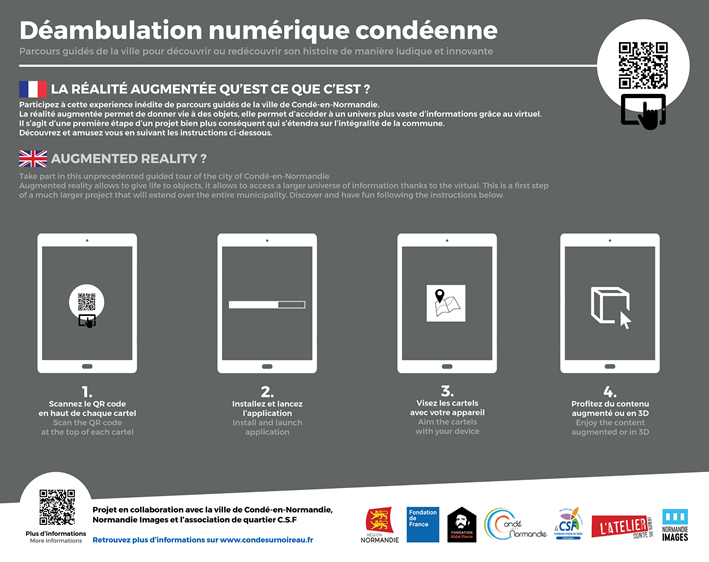 "Augmenter la réalité" permet de présenter des informations impossibles à imprimer (visualisation fixe ou animée d'un bâtiment ou d'une machine en trois dimensions, par exemple) à partir d'une ou plusieurs "cibles" définies. Ici, les "cibles" sont les panneaux imprimés sur les bornes qui jalonnent le parcours condéen.