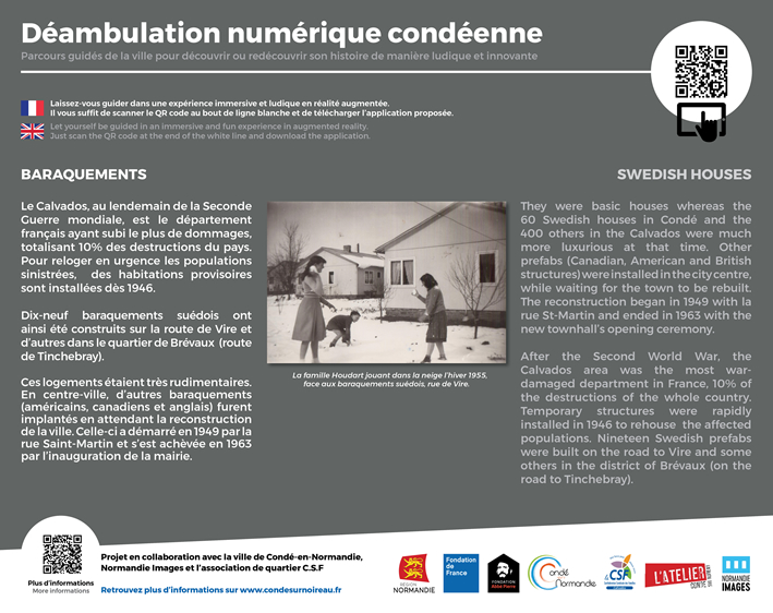 La Suède décide de donner 200 maisons suèdoises jumelées au département du Calvados, trente sont implantées à Condé sur Noireau. Maisons jumelles en bois , rectangulaires, dont les extrémités sont réalisées en pierre, avec des toits en ardoise, à quatre pans débordant largement.