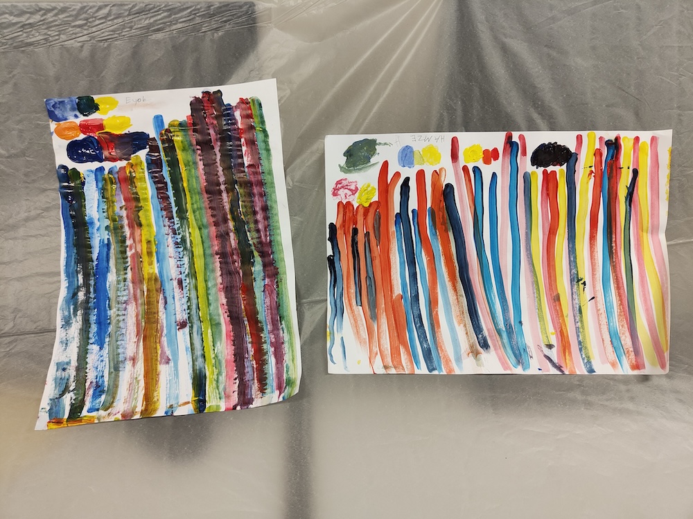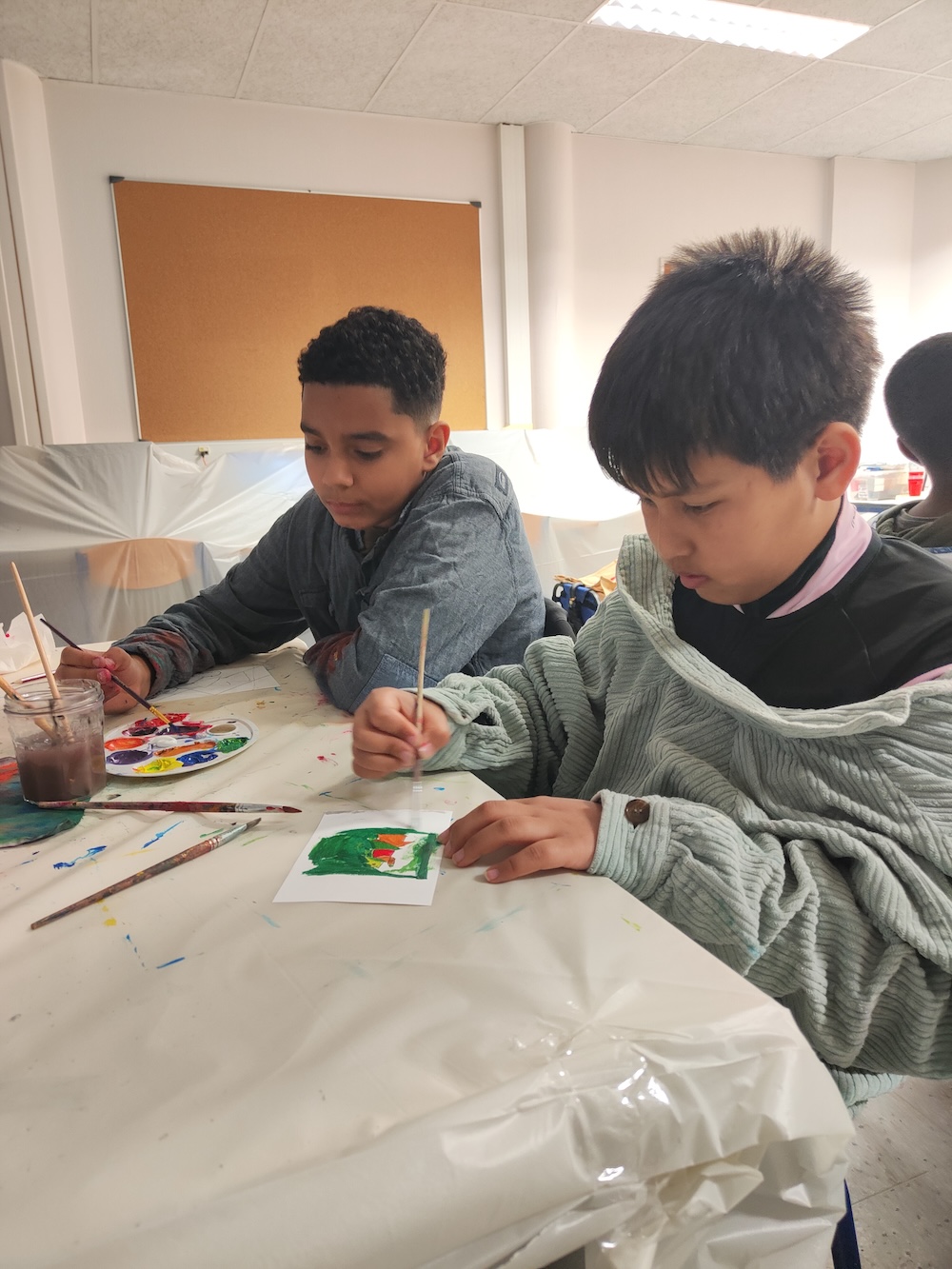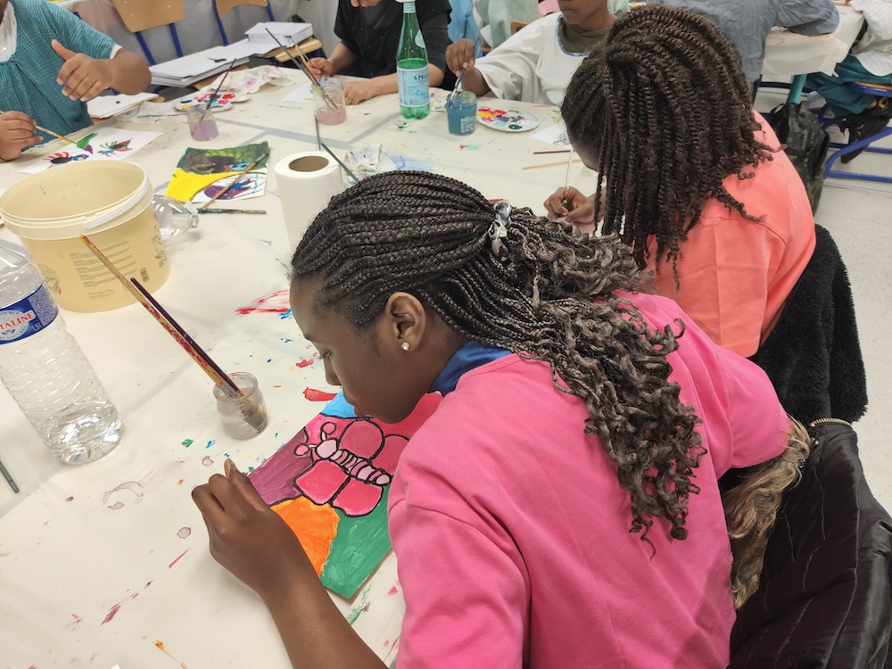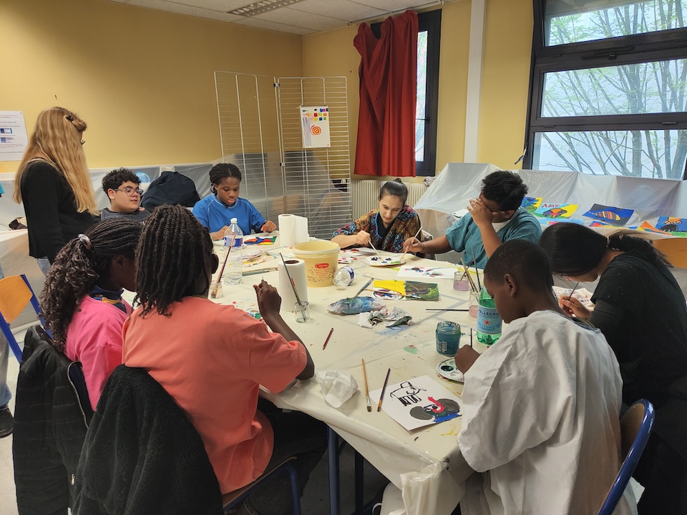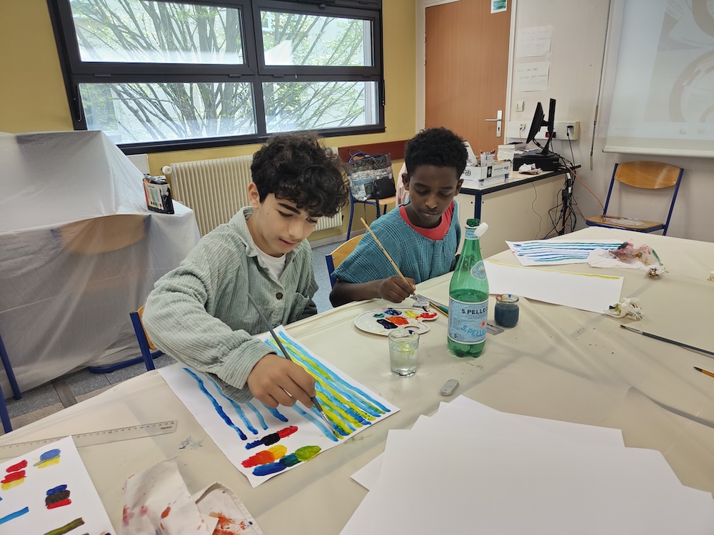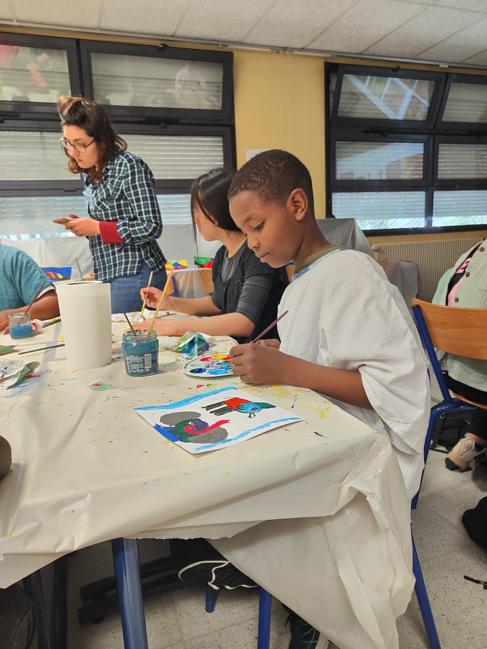 Marie a apporté des blouses de récupération pour ne pas se salir, les jeunes rigolent beaucoup en les essayant! Elle leur explique ensuite le BAba de la peinture : les couleurs primaires, les mélanges, l’utilisation du pinceau, de l’eau, de la palette… car tous ne sont pas familier de cet art. Après quelques petits exercices de pratique, elle leur montre des peintures colorées de Sonia et Robert Delaunay. Ils s’en inspirent en choisissant leurs formes et leurs couleurs sous le regard bienveillant de l’intervenante artistique.