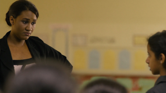 Et Wadjda est mise à l’épreuve par l’institutrice, devant le groupe. Celle-ci lui demande de chanter des sourates du Coran. Wadjda sèche. On lit l’embarras sur son visage dans un plan rapproché. Le groupe ricane. Le face à face entre Wadjda et l’institutrice est alors riche de sens. La composition du plan laisse au centre un grand vide entre les deux personnages. Symboliquement, cela peut retranscrire la distance avec laquelle Wadjda ressent cet enseignement religieux : elle n’y adhère pas.